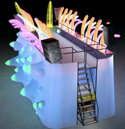 - Speakers will be mounted on the driver’s side of the bus, as will fog machines with a sweet and salty sea scent to tap into participants’ memories of the sea.   Downward pointing blue wavy lights will mimic the look and sensation of water projected on the playa.